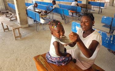 Modeleine Louis feeds a nutrient-rich porridge to her baby, Neisha Desir, at a church in Haiti. The 2010 earthquake left Modeleine and her family homeless. Thankfully she has kept Neisha Desir healthy through Compassion’s Child Survival Program, which helps babies and their caregivers.