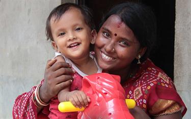 Madhuri plays with her daughter, Sraboni, outside their home in India. Before Compassion was forced to end its work in the country in 2017, Madhuri and Sraboni were in the Survival program. When Sraboni was born prematurely, special training that Madhuri learned in the program helped her baby recover.