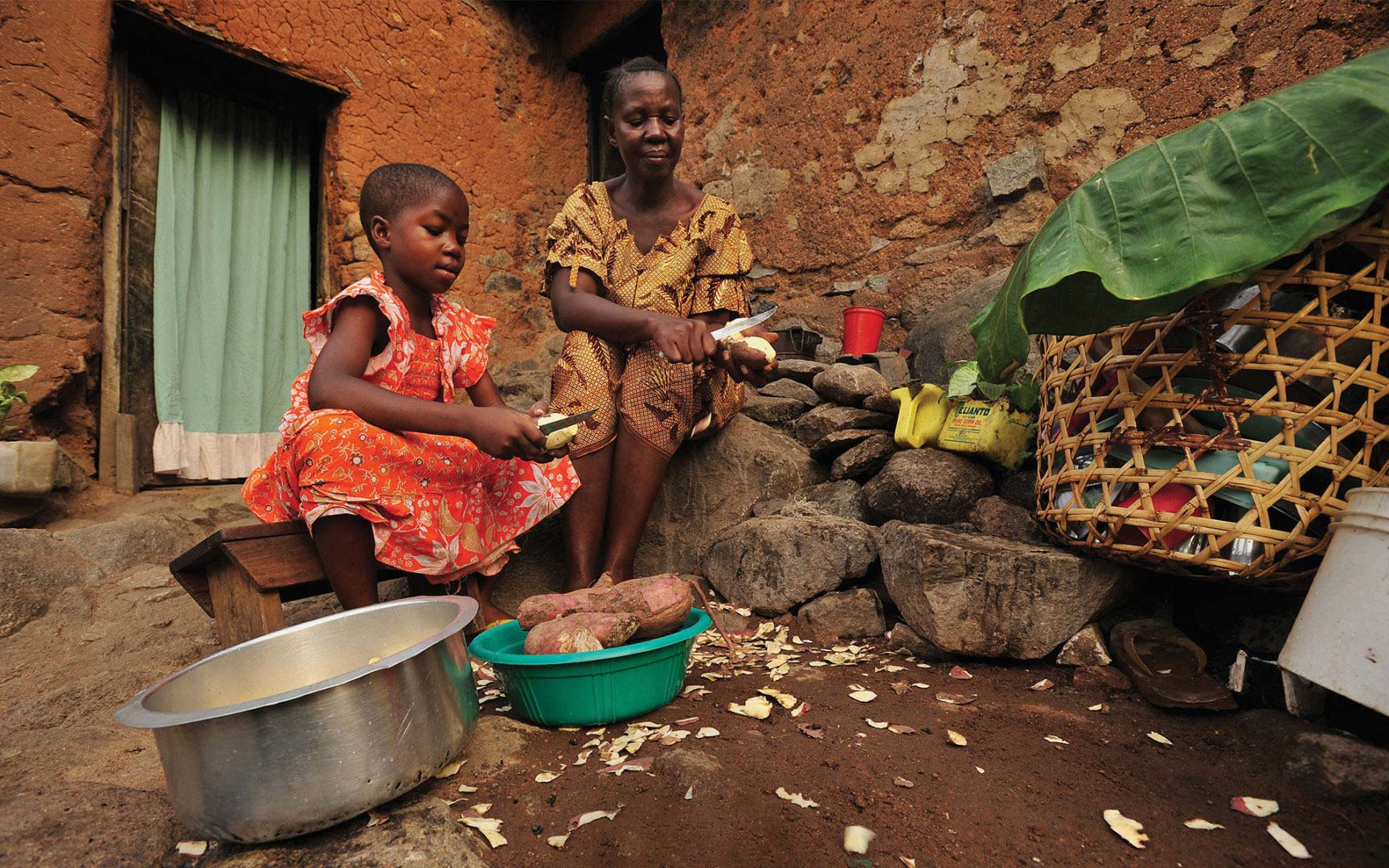 Nyabwiri, a sponsored girl in Tanzania, and her mother peel potatoes they will boil over a fire. Nyabwiri collected the water for cooking from a stream. Without the convenience of running water at home, her family devotes a significant amount of time to water-related chores.