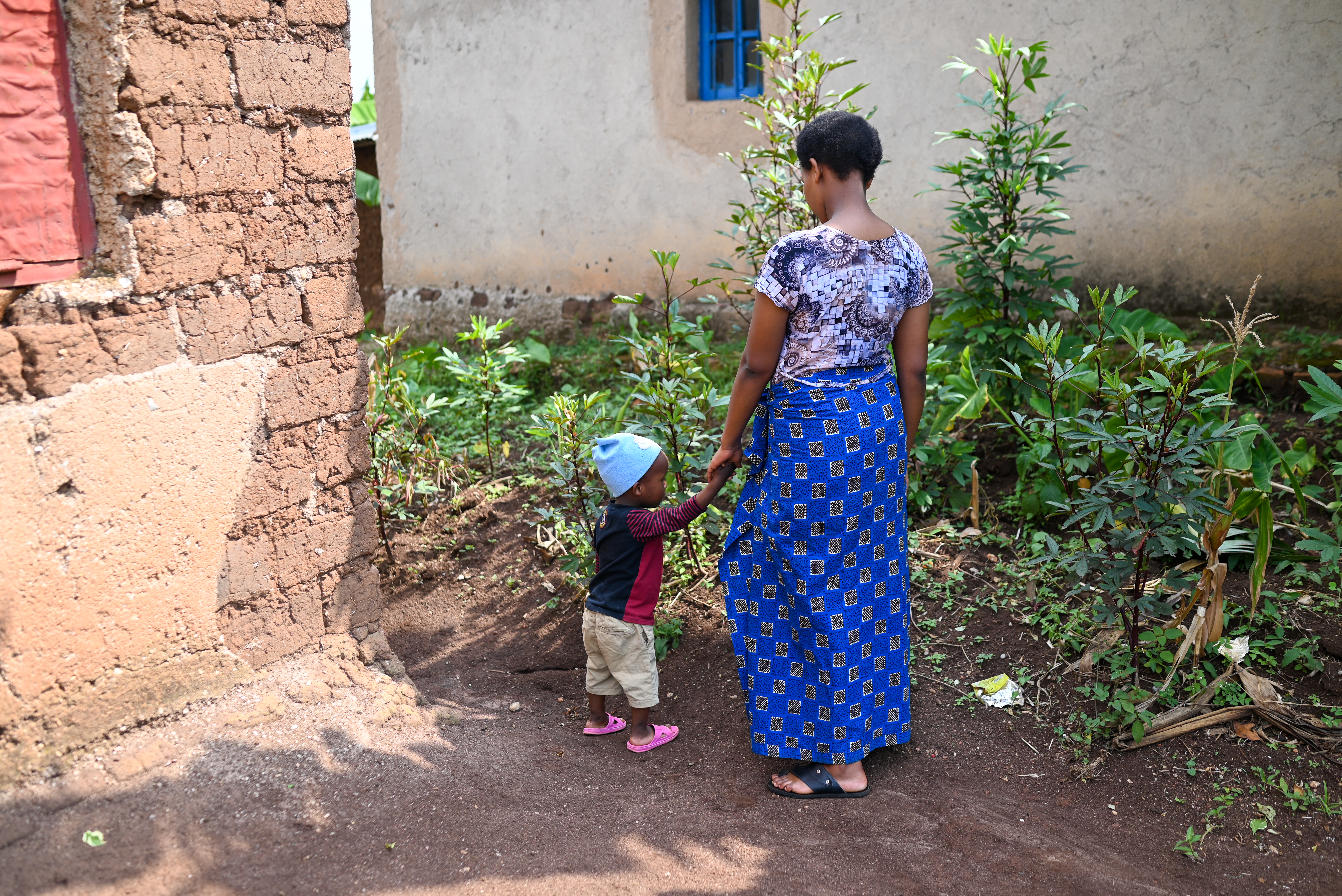 An African mom holds the hand of a young child as they turn their backs to the camera.
